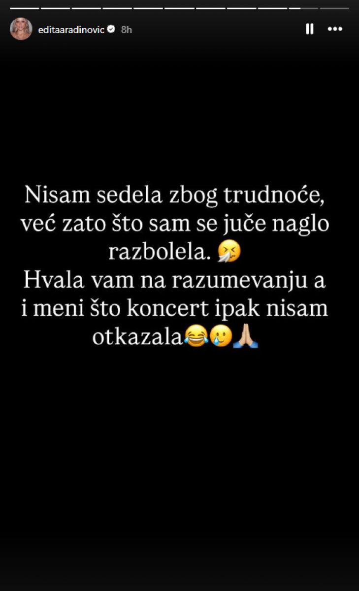 "Nisam sedela zbog trudnoće, već zato što sam se juče naglo razbolela. Hvala vam na razumevanju, a i meni što koncert ipak nisam otkazala", napisala je ona, na čijem je nastupu nedavno došlo do incidenta.