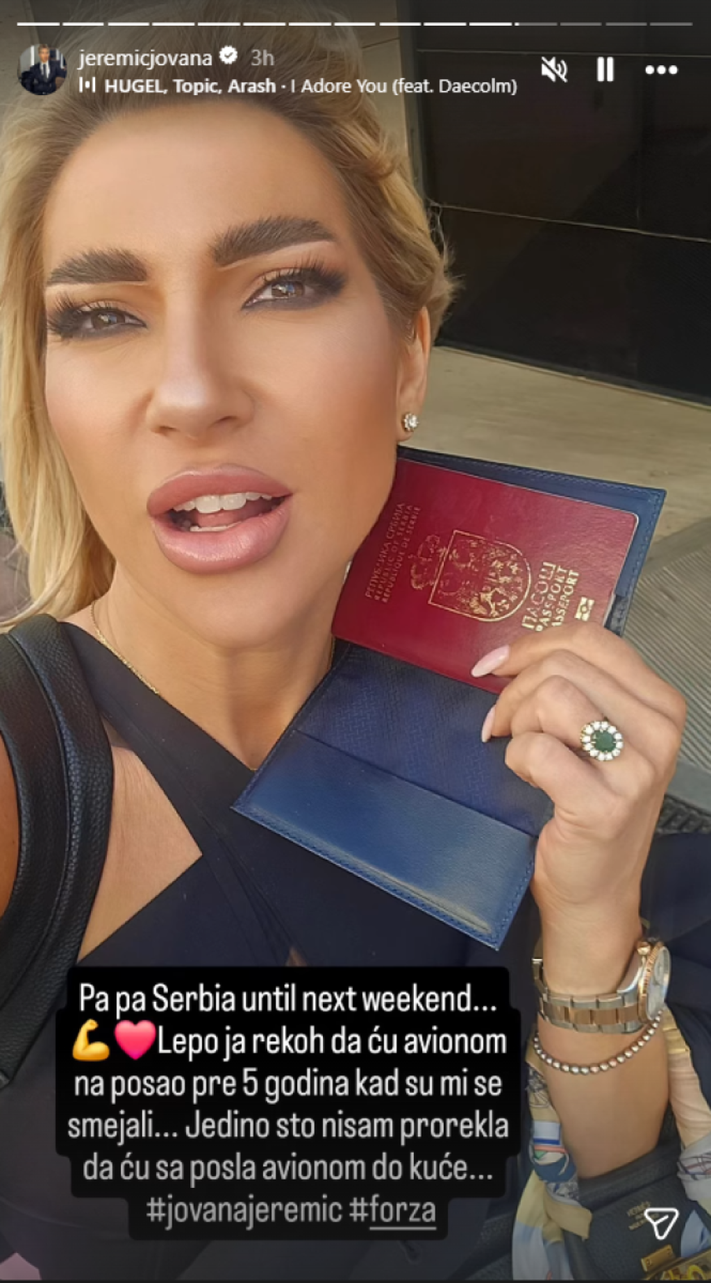 "Pa, pa, Srbijo, do sledeće nedelje. Lepo sam rekla da ću avionom ići na posao još pre pet godina, kada su mi se smejali... Jedino što nisam predvidela jeste da ću sa posla avionom i do kuće", napisala je Jovana, ne otkrivši destinaciju na koju je otputovala.