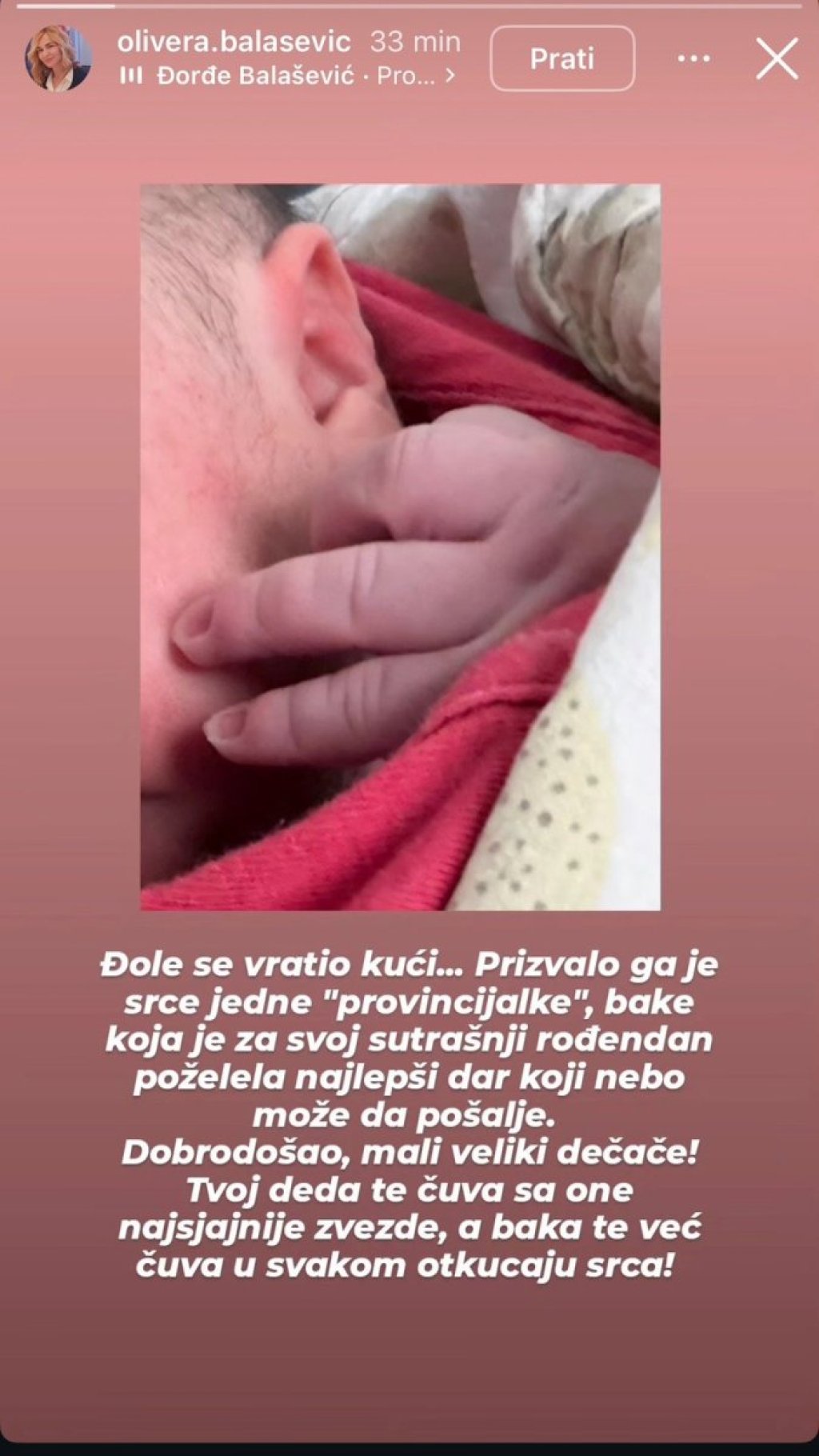 "Đole se vratio kući... Prizvalo ga je srce jedne "provincijalke", bake koja je za svoj sutrašnji rođendan poželela najlepši dar koji nebo može da pošalje. Dobrodošao, mali veliki dečače! Tvoj deda te čuva sa one najsjajnije zvezde, a aka te već čuva u svakom otkucaju srca", napisala je Olivera.