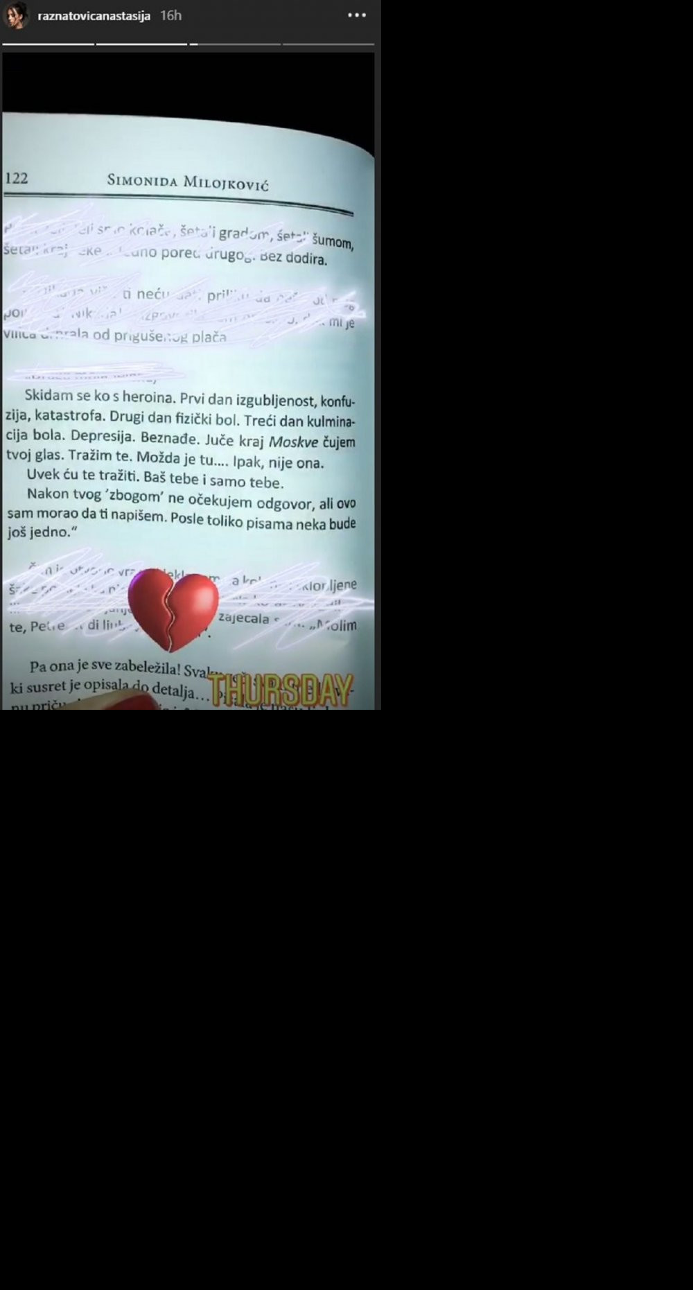 - Skidam se ko s heroina. Prvi dan izgubljenost, konfuzija, katastrofa. Drugi dan fizički bol. Treći dan kulminacija bola. Depresija. Beznađe. Juče kraj "Moskve" čujem tvoj glas. Tražim te. Možda je tu... Ipak, nije ona. Uvek ću te tražiti. Baš tebe i samo tebe. Nakon tvog "zbogom" ne očekujem odgovor, ali ovo sam morao da ti napišem. Posle toliko pisama neka bude još jedno - objavila je Anastasija, dodavši uz i jedno slomljeno srce.