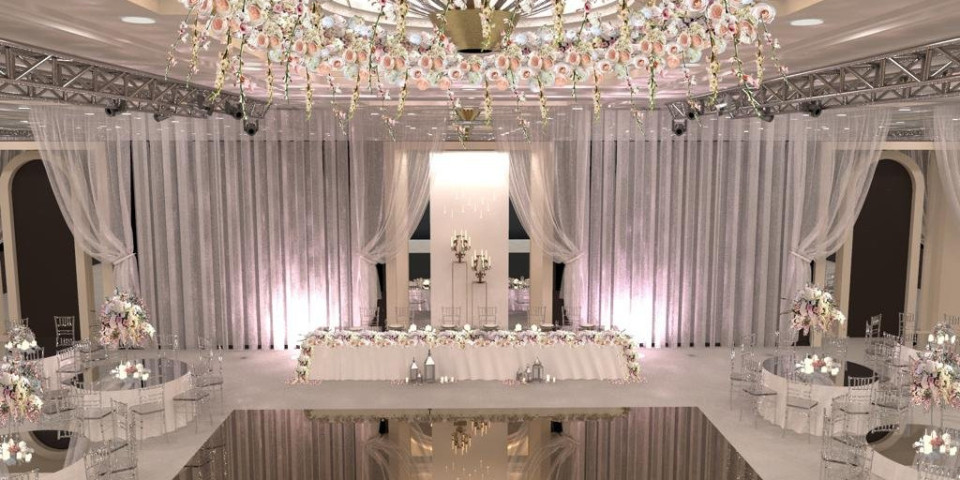 Čitava sala presvučena je u belo - ispunjavaju je stakleni stolovi i stolice, dok je sve upotpunjeno pozlaćenim svećnjacima i impozantnim kristalnim lusterom. U čitavoj sali dominiraju bogati cvetni aranžmani nežnih tonova.