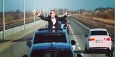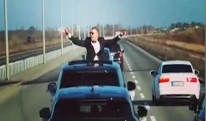 Mladoženja je, kako se i očekivalo, među najveselijima, a u jednom trenutku on je izašao kroz prozor na krovu automobila, raširio ruke i zapevao.