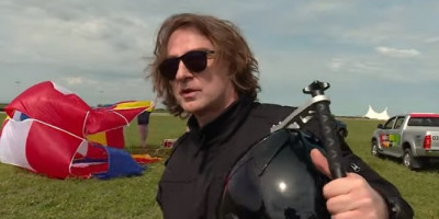 Željko Mitrović je naime, uspeo da izvede bezbedan parasejling na kopnu sa pokretne hidraulične platforme za poletanje i sletanje.