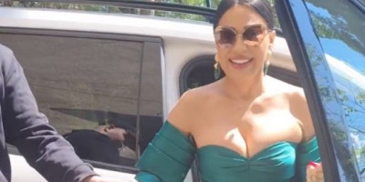 Ceca se pojavila u zelenom kompletu i sa velikim naočarima izašla iz auta, a svi su primetili da joj je pripijeni gornji deo maksimalno istakao grudi.