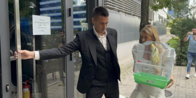 A potom su stigli i mladenci, Saška je venčanicu zamenila kratkom toaletom i svi su primetili papagaja kog je nosila u rukama.