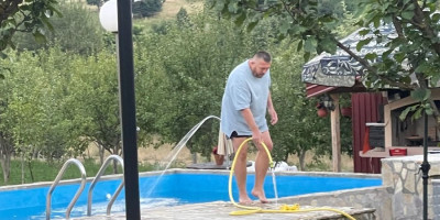 Naš paparaco ga je ulovio u dvorištu kuće u okolini Ulcinja, daleko od gužve, kako sam sređuje bazen. Ćemo se ponašao kao kod svoje kuće, pa nam u prvi mah nije bilo jasno da li je vlasnik kuće ili je samo gost.