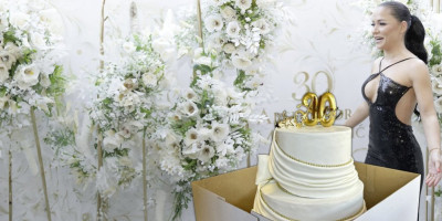 I dok je slavljenicina haljina potpuno crna, torta je sasvim suprotno, potpuno bela sa zlatnim detaljima. Sastoji se od nekoliko spratova, a na vrhu se nalazi broj 30 i nadimak slavljenice - Alex.
