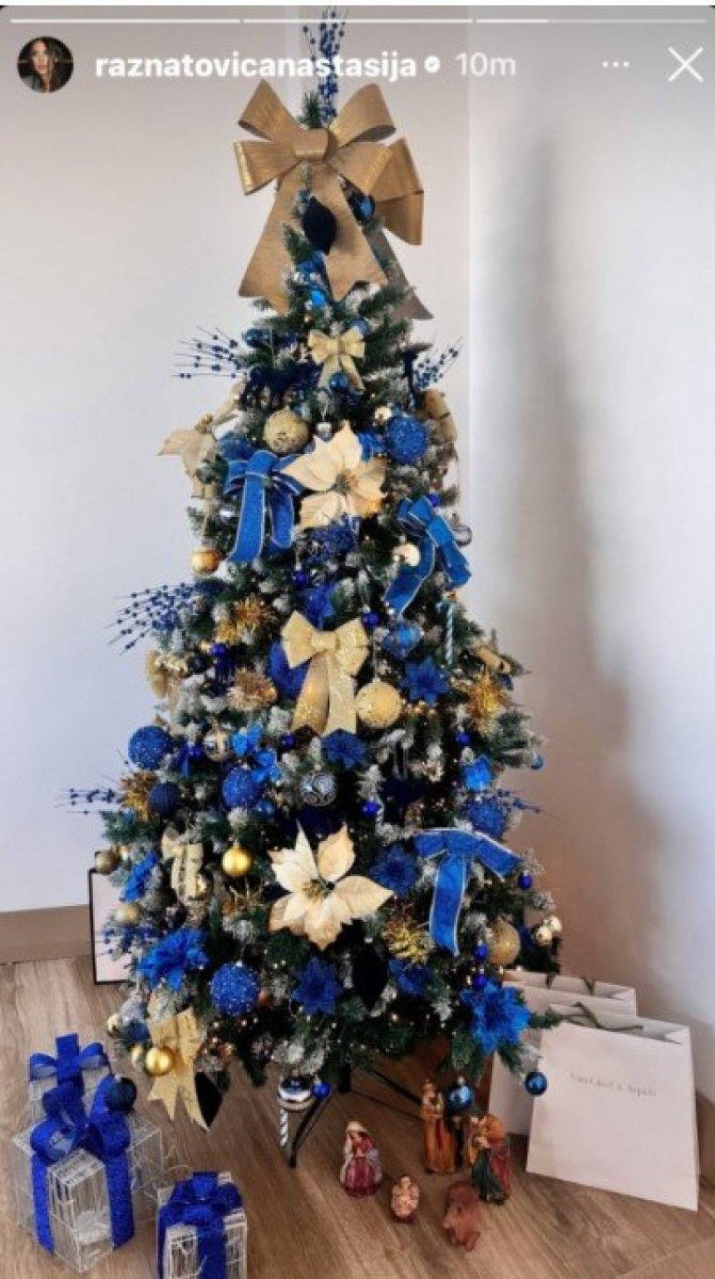 Anastasija je na svom storiju na Instagramu podelila kako izgleda njena jelka nakon kićenja. Na njoj preovlađuju plavi i zlatni ukrasi, a osim toga Anastasija se potrudila da na novogodišnjem drvetu budu zastupljene i mašne, kojih ima u izobilju.