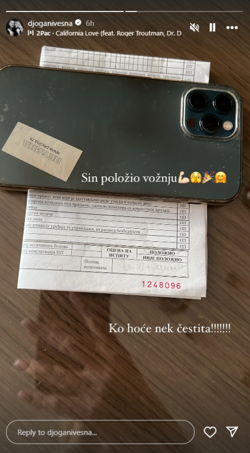 - Sin položio vožnju. Ko hoće neka čestita! - napisala je Vesna.
