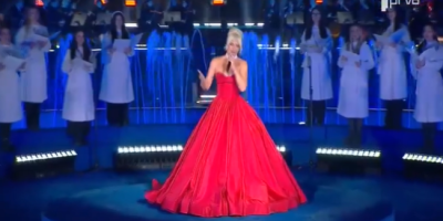 Jelena Karleuša je u dugačkoj crvenoj toaleti, sa podignutom kosom u punđu i uz boje srpske zastave koje su se prikazale na video-bimovima, otpevala megahit pevačice Goce Lazarević.