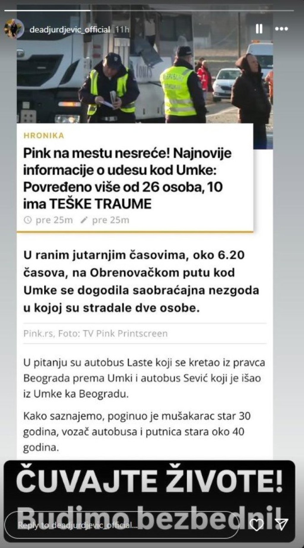 - Čuvajte živote! Budimo bezbedni! - poručila je Dea uz sliku vesti o ovom događaju.