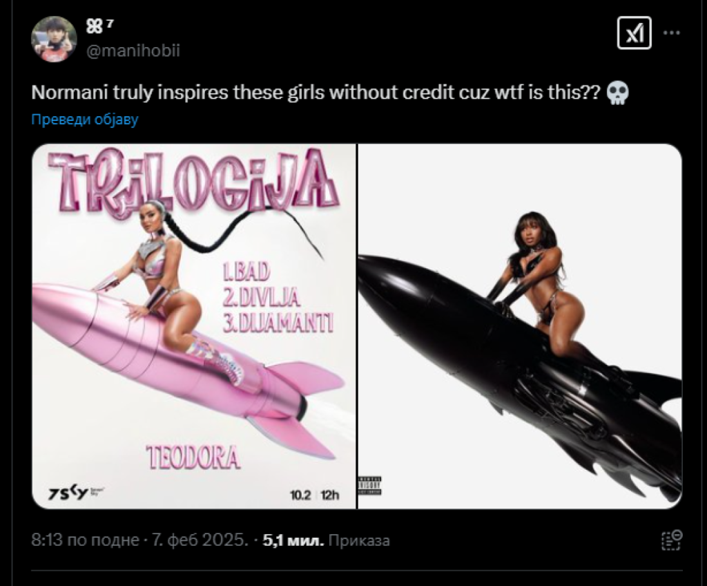 Korisnici društvenih mreža primetili su da su fotografije gotovo identične fotografijama pevačice Normani, objavljenim pre manje od godinu dana uz njen album "Dopamin". Jedino što se razlikuje su boje rakete, a čak su i kostimi veoma slični. Dok je Teodora u pink kostimu na ružičastoj raketi, Normani je u crnom kostimu na raketi iste boje.