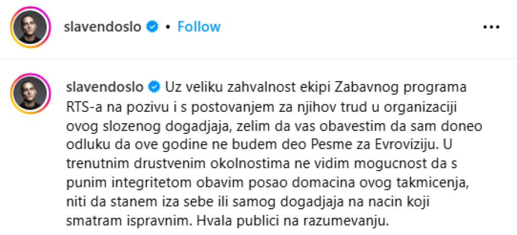 "Uz veliku zahvalnost ekipi Zabavnog programa RTS-a na pozivu i s poštovanjem za njihov trud u organizaciji ovog složenog događaja, želim da vas obavestim da sam doneo odluku da ove godine ne budem deo Pesme za Evroviziju. U trenutnim društvenim okolnostima ne vidim mogućnost da s punim integritetom obavim posao domaćina ovog takmičenja, niti da stanem iza sebe ili samog događaja na način koji smatram ispravnim. Hvala publici na razumevanju", poručio je Došlo na svom Instagram profilu.