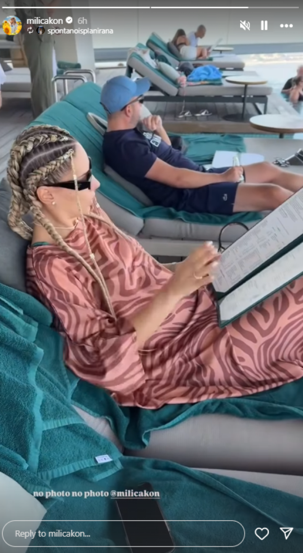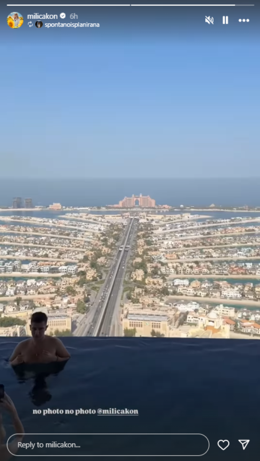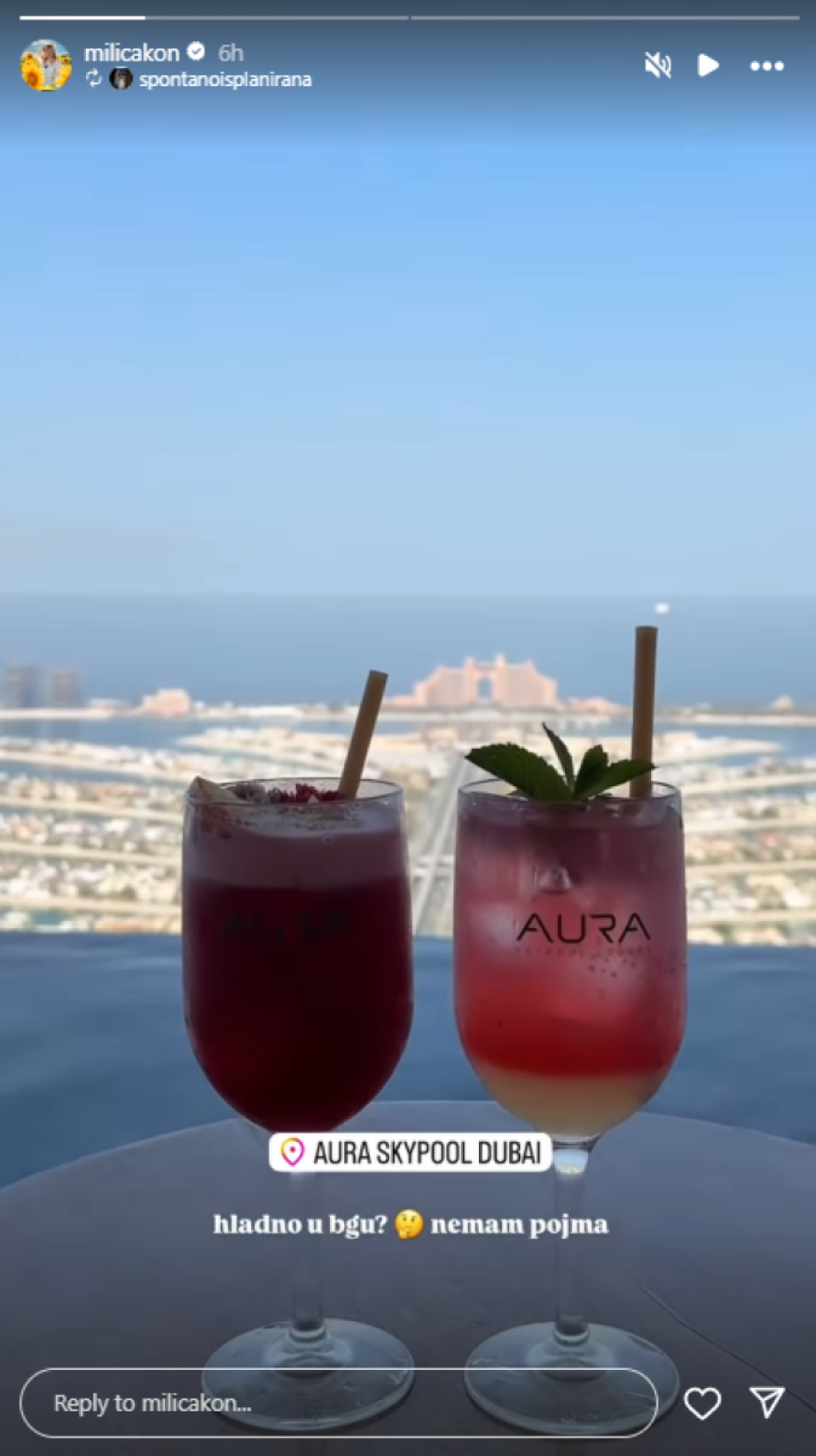 Na svom Instagramu objavila nekoliko fotografija i snimak sa bazena na krovu nebodera. Dok je sa prijateljicom ispijala koktele uživala je u pogledu od kog zastaje dah. Milica se opuštala na ležaljci u ležernoj haljini sa animal printom i sunčanim naočarima i pažljivo birala šta će sa menija odabrati.