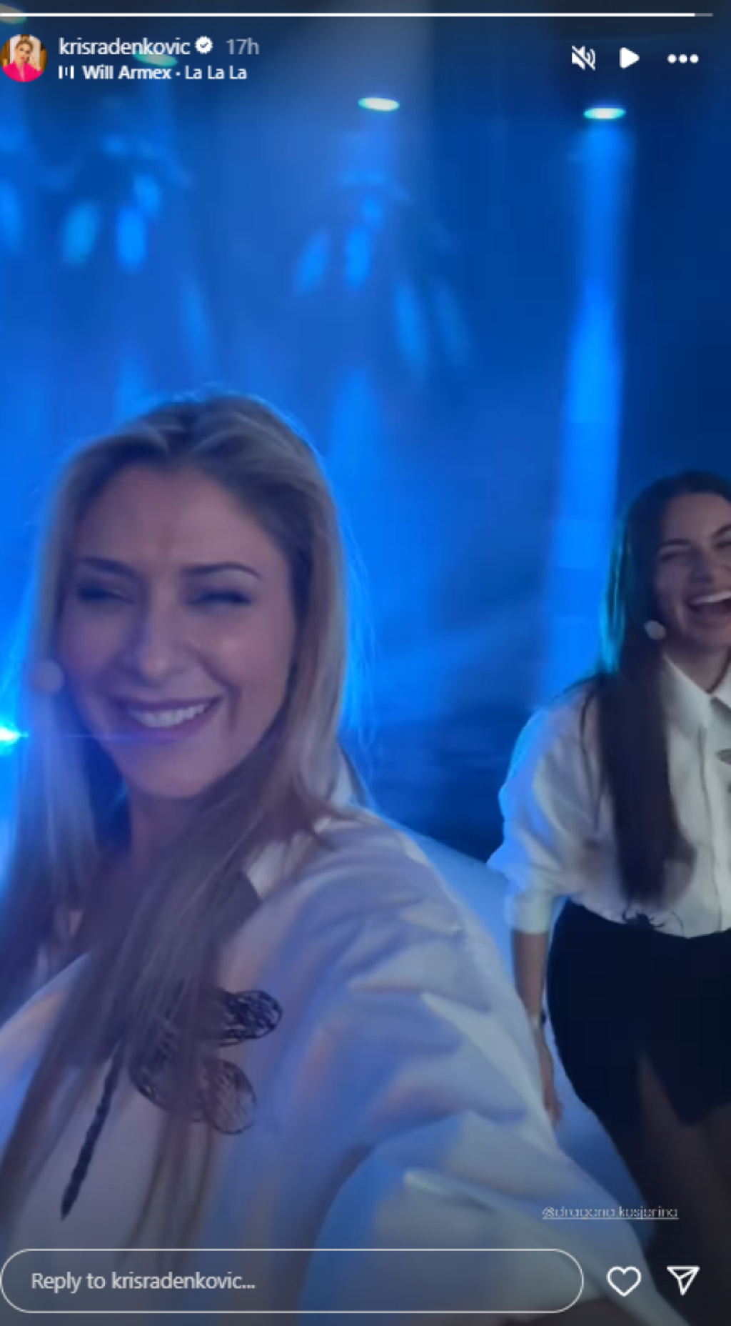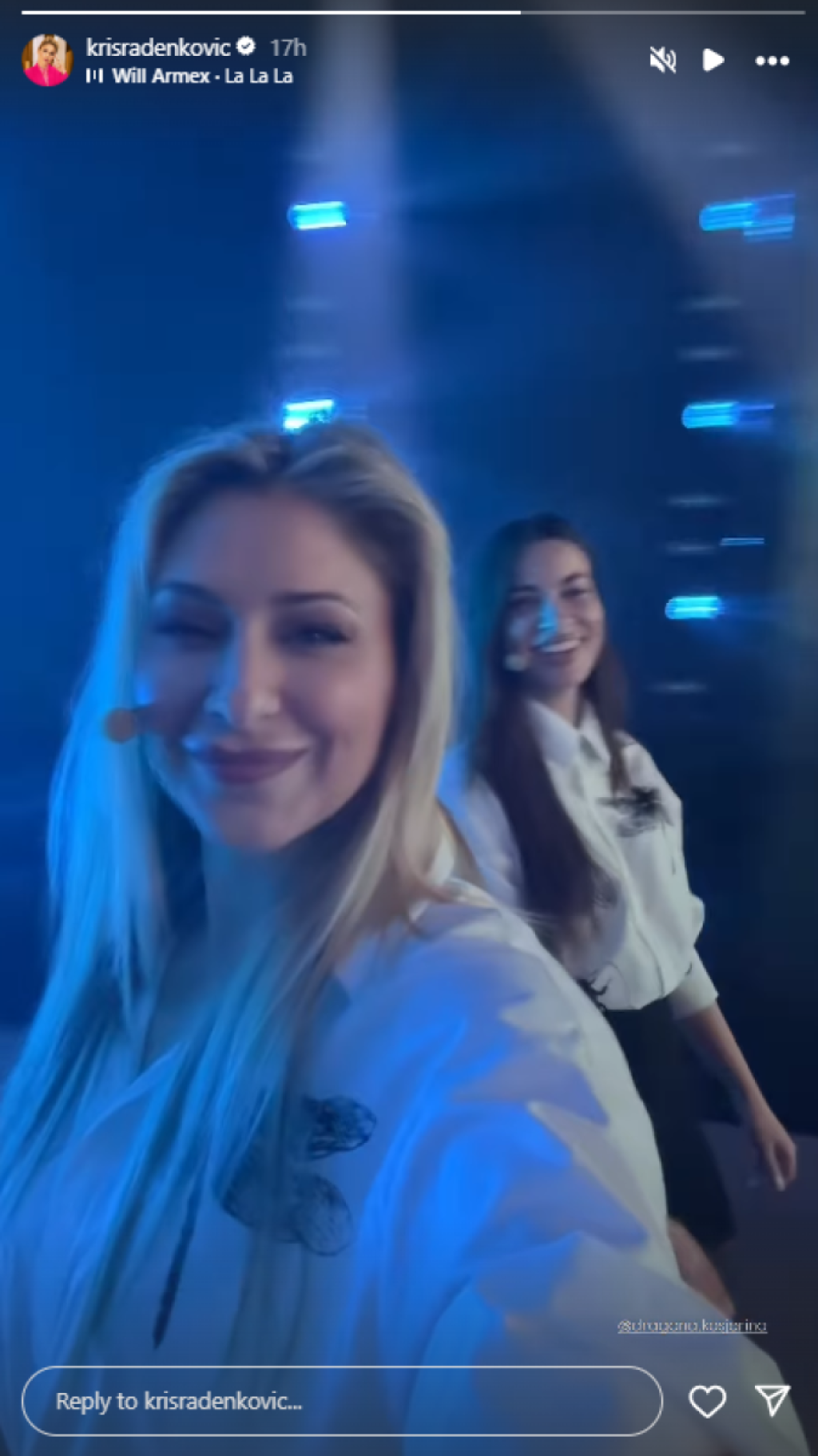 Voditeljka Kristina Radenković podelila je snimak na Instagramu na kom je na sceni sa koleginicom Draganom Kosjerinom, koja se prošle godine udala i dodala prezime Perduv. Njih dve su dobro raspoložene i sudeći po snimku zabavljaju se tokom priprema za prvo polufinale.