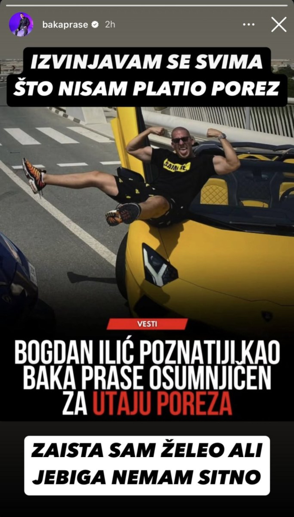 Sumnja se da je Bogdan Ilić, kao odgovorno lice, osnivač i direktor preduzeća "Baka prase doo", u cilju izbegavanja plaćanja poreza na dobit pravnih lica, pružio lažne informacije koje su bitne za utvrđivanje ove porezne obaveze. A sada se i on oglasio.