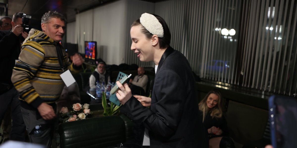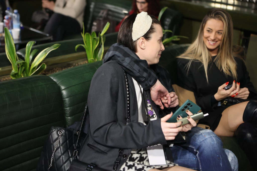 Angelina Matić je pred okupljenim pripadnicima sedme sile, u zgradi Radio-televizije Srbije, zablistala u mini suknji, beloj majici i sakou. Kosu ošišanu u paž je pokupila rajfom, a na licu je imalo malo šminke.