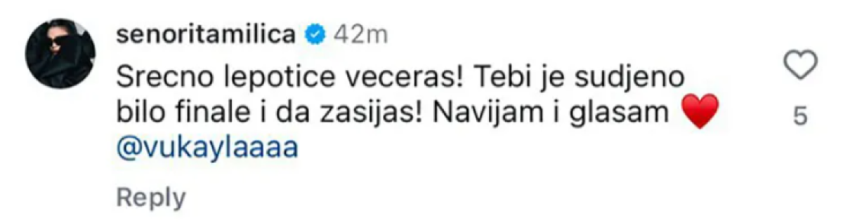 Pored velike armije fanova, Vukajla ima podršku i od svoje koleginice, Milice Pavlović, koja joj je poželela uspeh pred veliko finale.