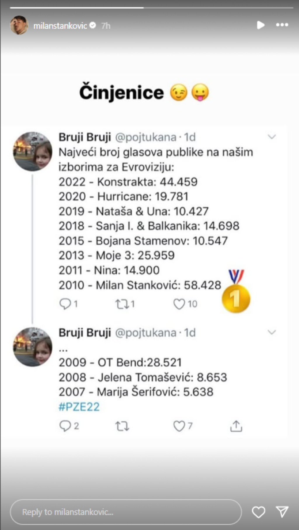 Milan Stanković, koji se poslednjih godina povukao sa javne scene, oglasio se na svom Instagramu i iskoristio momenat da javnost podseti da rekor u broju osvojenih glasova publike i dalje drži on.