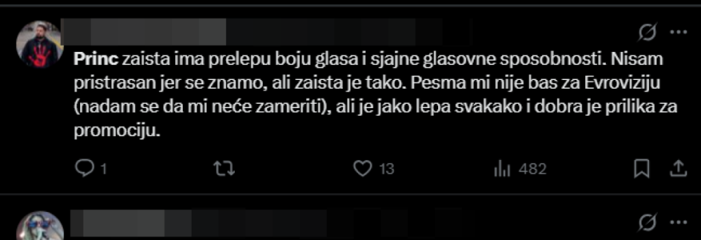 "Princ zaista ima prelepu boju glasa i sjajne glasovne sposobnosti. Nisam pristrasan jer se znamo, ali zaista je tako. Pesma mi nije baš za Evroviziju (nadam se da mi neće zameriti), ali je jako lepa svakako i dobra je prilika za promociju."