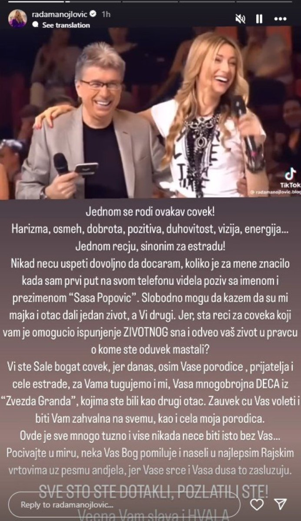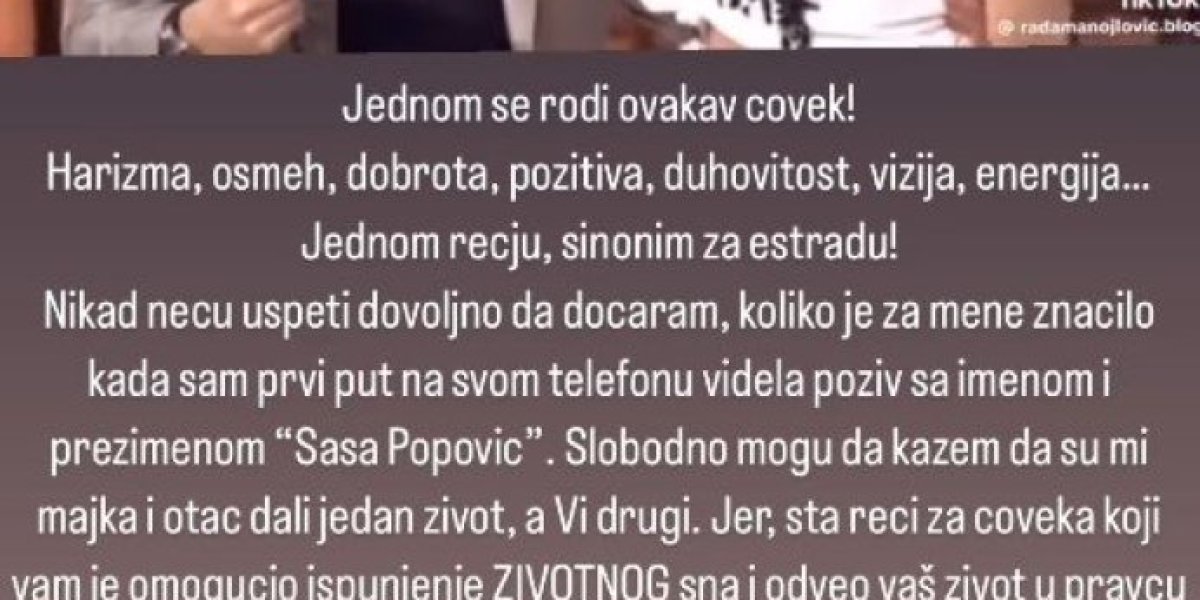 - Jednom se rodi ovakav čovek! Harizma, osmeh, dobrota, pozitiva, duhovitost, vizija, energija... Jednom rečju, sinonim za estradu! Nikad neću uspeti dovoljno da dočaram koliko je za mene značilo kada sam prvi put na svom telefonu videla poziv sa imenom i prezimenom ”Saša Popović” - napisala je na svom Instagram profilu Rada Manojlović kojoj je Popović bio kao drugi otac.