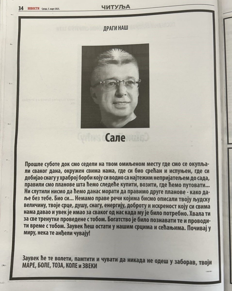 Danas je u novinama objavljena čitulja kojom su se prijatelji Saše Popovića oprostili od njega. Oni nisu poznati javnosti, ali je direktor "Granda" sa njima najviše provodio vremena.