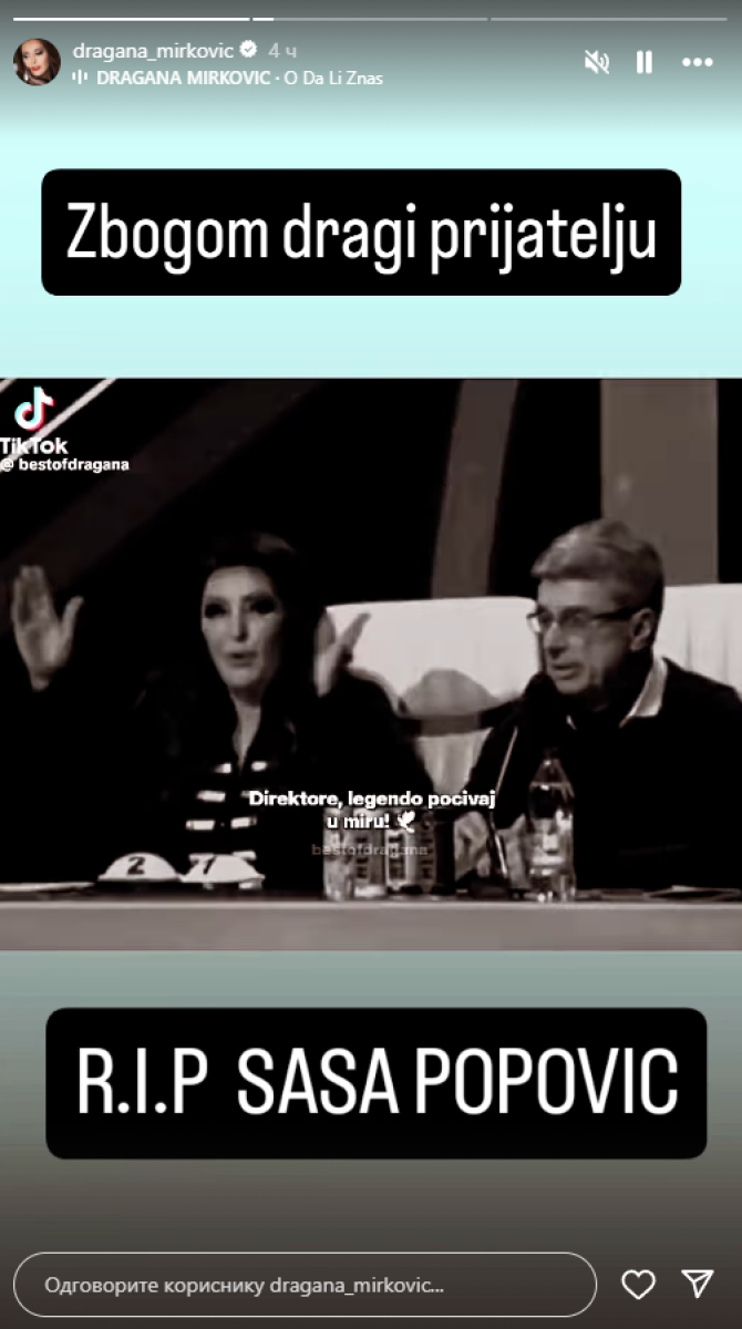 Dragana Mirković se nije pojavila na sahrani, ali je našla način kako da se oprosti od svog prijatelja, Saše Popovića.