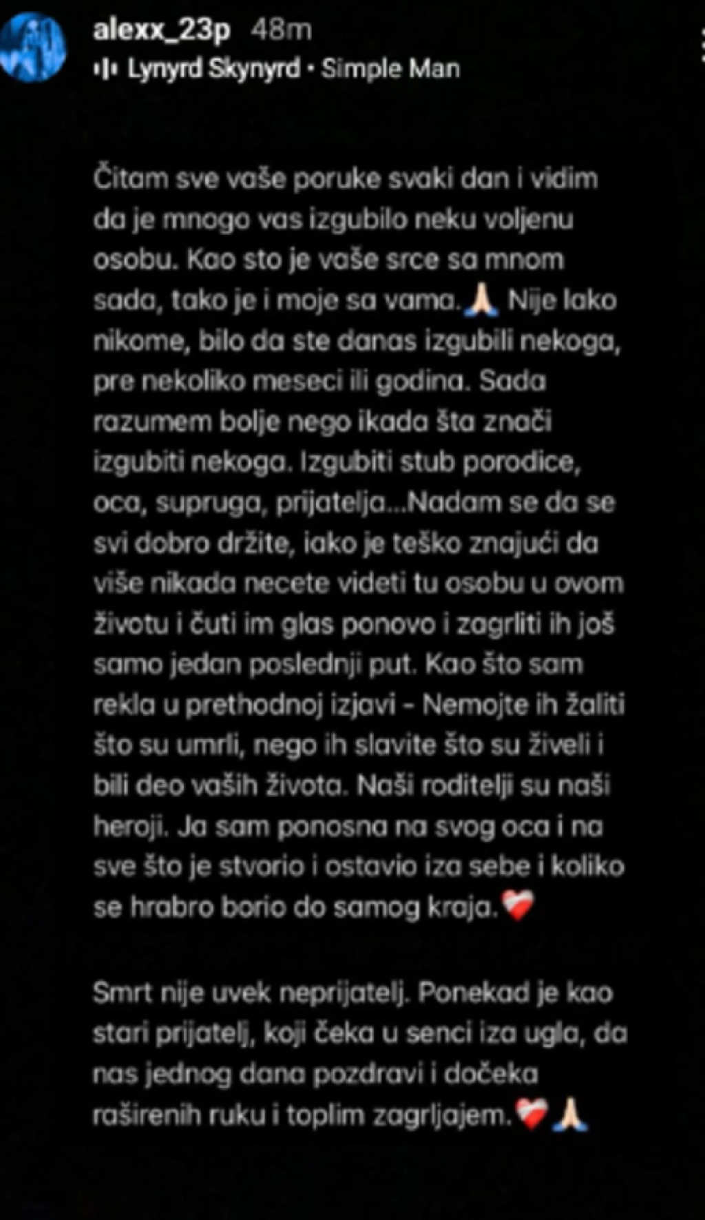 - Čitam sve vaše poruke svaki dan i vidim da je mnogo vas izgubilo neku voljenu osobu. Kao što je vaše srce sa mnom sada, tako je i moje sa vama. Nije lako nikome, bilo da ste danas izgubili nekoga, pre nekoliko meseci ili godina. Sada razumem bolje nego ikada šta znači izgubiti nekoga. Izgubiti stub porodice, oca, supruga, prijatelja.... Nadam se da se svi dobro držite iako je teško, znajući da više nikada nećete videti tu osobu u ovom životu i čuti im glas ponovo i zagrliti ih još samo jedan, poslednji put. Kao što sam rekla u prethodnoj izjavi - Nemojte ih žaliti što su umrli, nego ih slavite što su živeli i bili deo vaših života. Naši roditelji su naši heroji. Ja sam ponosna na svog oca i na sve šti je stvorio i ostavio za sebe i koliko se hrabro borio do samog kraja. Smrt nije uvek neprijatelj. Ponekad je kao stari prijatelj koji vas čeka u senci iza ugla, da nas jednog dana pozdravi i dočeka raširenih ruku i toplim zagrljajem.