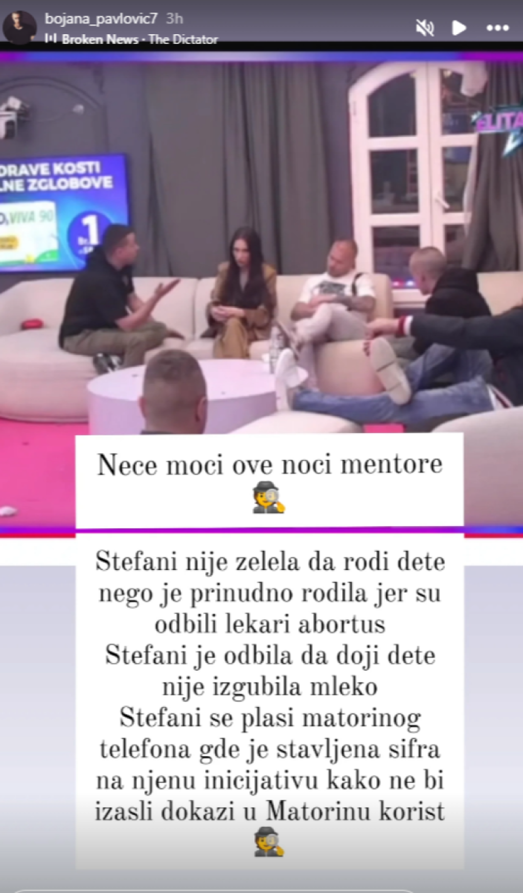 "Stefani nije želela da rodi dete, nego je prinudno rodila jer su odbili lekari abortus. Stefani je odbila da doji dete, nije izgubila mleko. Stefani se plaši Matorinog telefona gde je stavljena šifra na njenu incijativu kako ne bi izašli dokazi u Matorinu korist", napisala je Bojana na Instagramu.