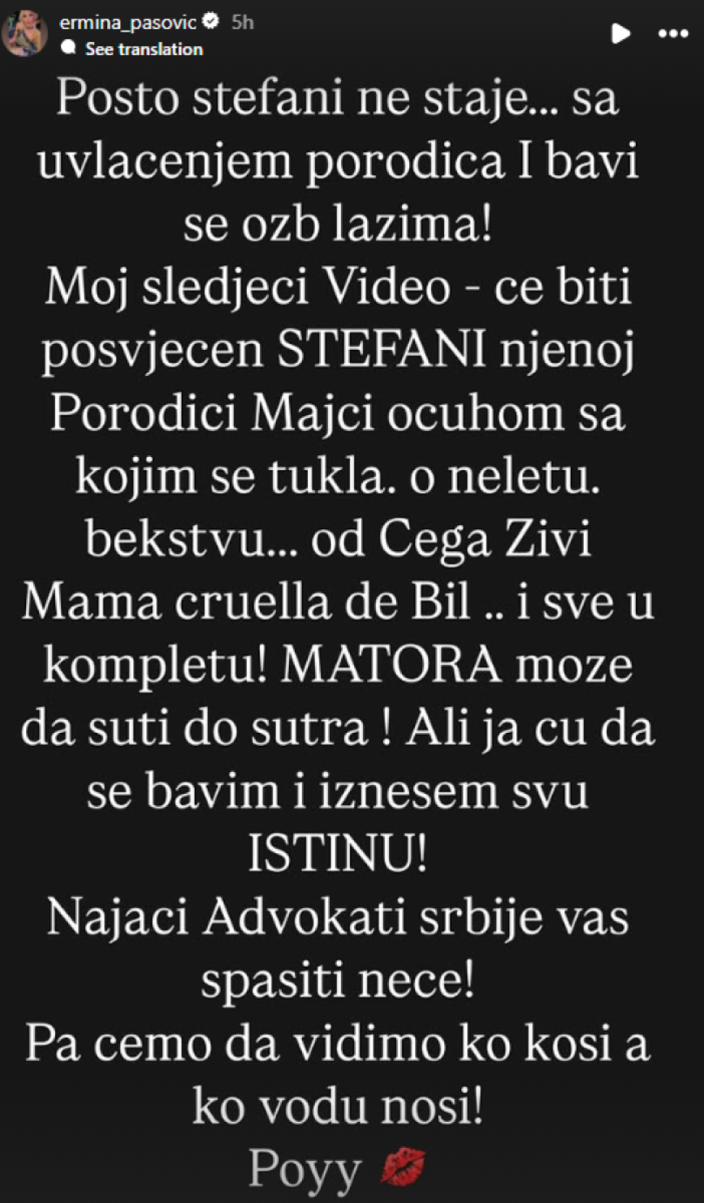 - Pošto Stefani ne staje... sa uvlačenjem porodica i bavi se ozbiljnim lažima! Moj sledeći video će biti posvećen Stefani, njenoj porodici, majci, očuhu sa kojim se tukla - deo je poruke koju je Ermina napisala i dodala da sledi potpuno razotkrivanje, kako Stefani, tako i njene porodice.