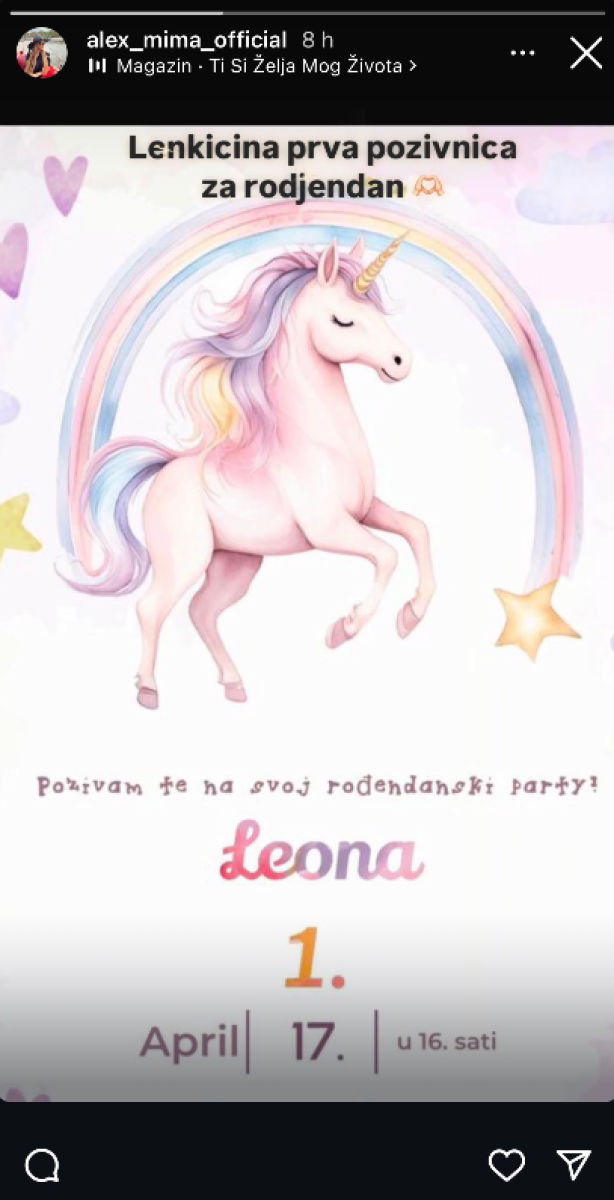 Na osnovu pozivnice vidi se da će Leonina rođendanska žurkica biti u četvrtak, 17. aprila u 16 časova, ali lokacija nije precizirana.