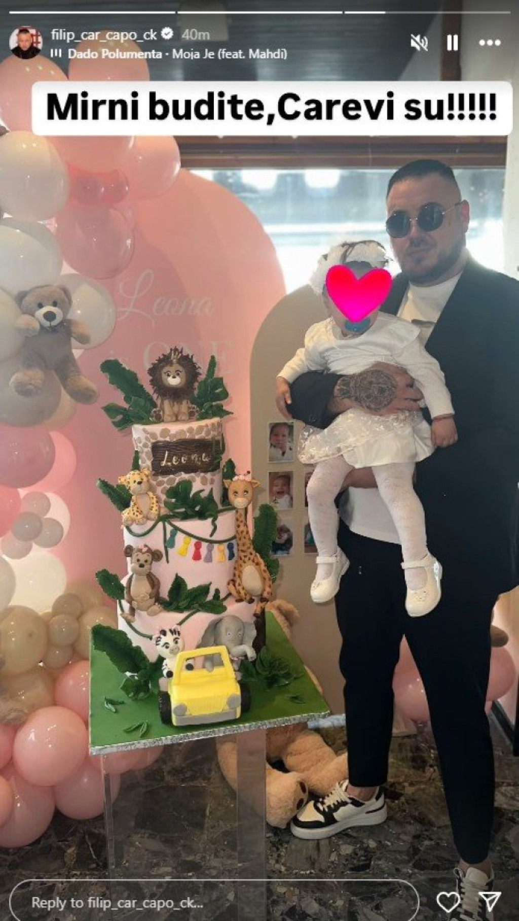 Leona Car na sebi je imala belu haljinu sa leptirićima, a stajling su zaokružile bele cipelice i traka za kosu. Dekoracija je bila u roze i belim tonovima, a baloni, plišani medvedići i torta na tri sprata sa motivima životinjskog carstva nisu izostali.
