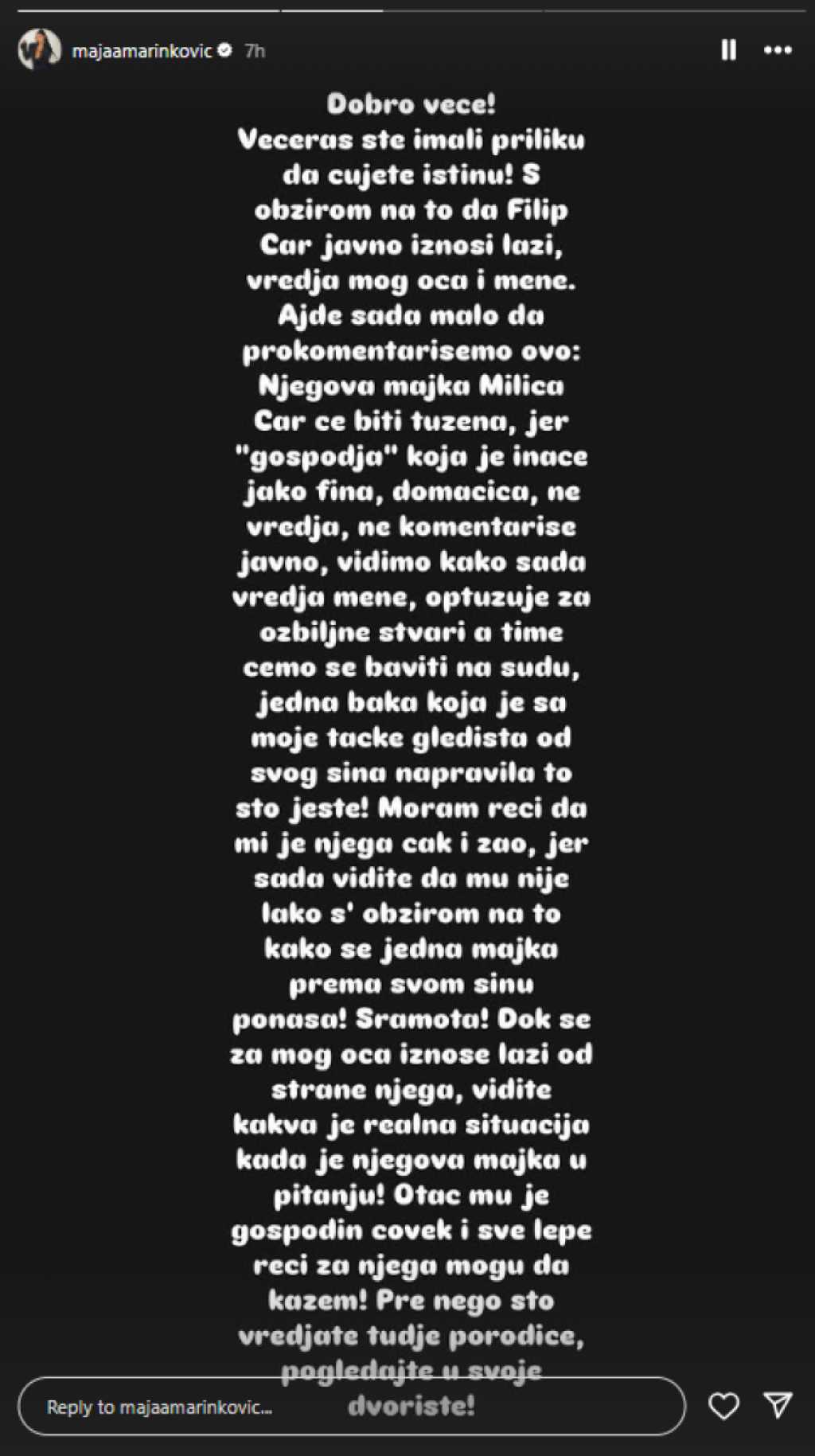 "Dobro veče! Večeras ste imali priliku da čujete istinu! S obzirom na to da Filip Car javno iznosi laži, vređa mog oca i mene. Ajde sada malo da prokomentarišemo ovo: Njegova majka Milica Car će biti tužena, jer ''gospođa'' koja je inače jako fina, domaćica, ne vređa, ne komentariše javno, vidimo kako sada vređa mene, optužuje za ozbiljne stvari, a time ćemo se baviti na sudu, jedna baka koja je sa moje tačke gledišta od svog sina napravila to što jeste! Moram reći da mi je njega čak i žao, jer sada vidite da mu nije lako s obzirom na to kako se jedna majka prema svom sinu ponaša! Sramota! Dok se za mog oca iznose laži od strane njega, vidite kakva je realna situacija kada je njegova majka u pitanju. Otac mu je gospodin čovek i sve lepe reči za njega mogu da kažem. Pre nego što vređate tuđe porodice, pogledajte u svoje dvorište", napisala je Maja na storiju na Instagramu.