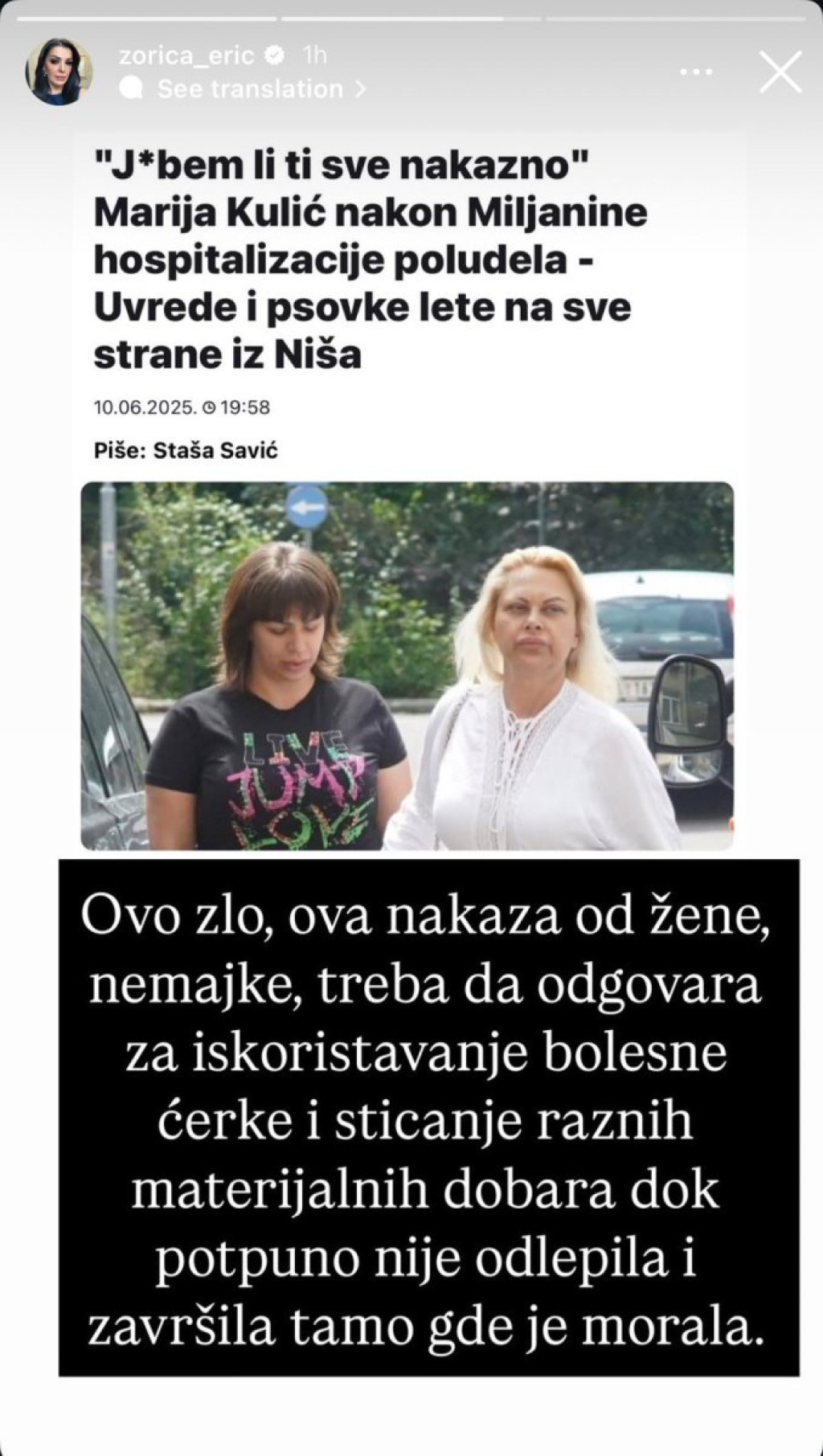 Zorica Erić je na svom Instagramu iznela je jezive optužbe na račun Marije Kulić, nazivajući je "nakazom", "zlom", pa čak i "krmačom koja treba da trune u zatvoru".