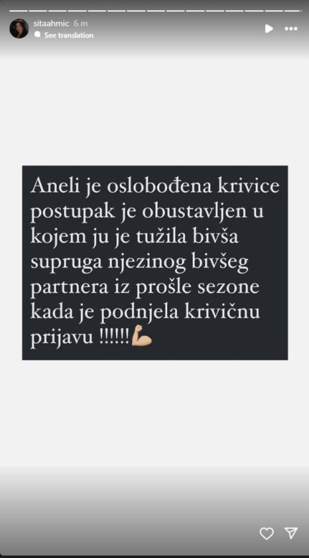 "Oslobođena je krivice, postupak je obustavljen u kojem ju je tužila bivša supruga njenog bivšeg partnera iz prošle sezone, kada je podnela i krivičnu prijavu", napisala je Ahmićeva.