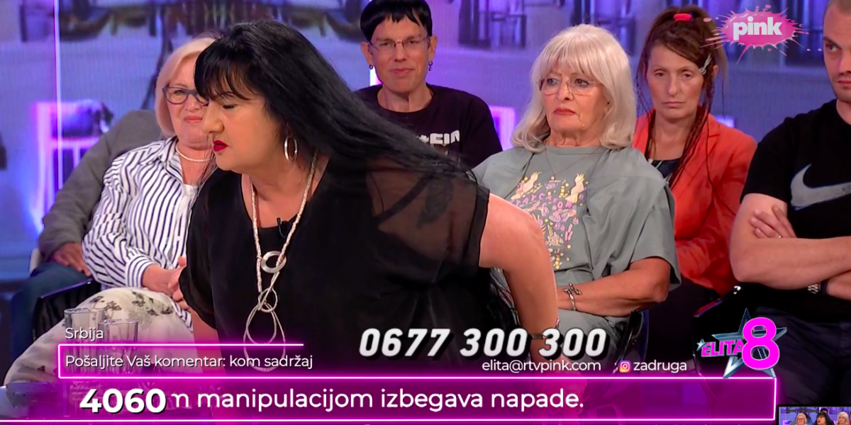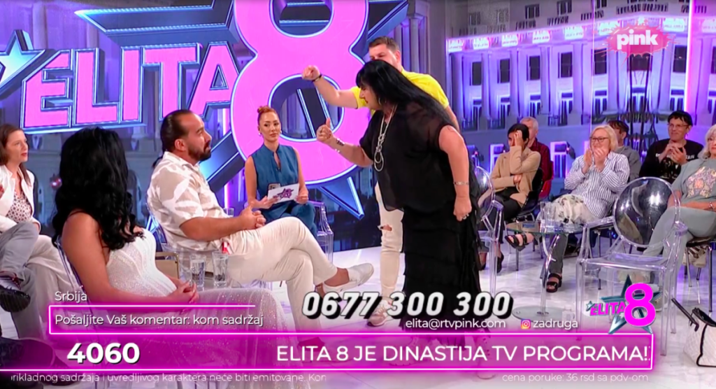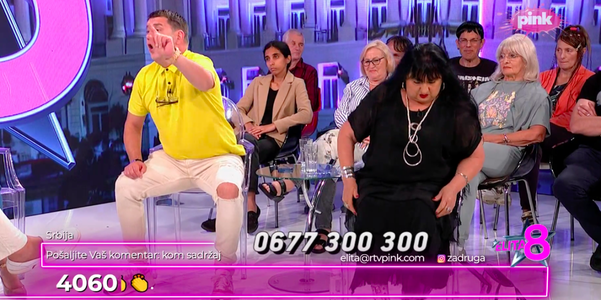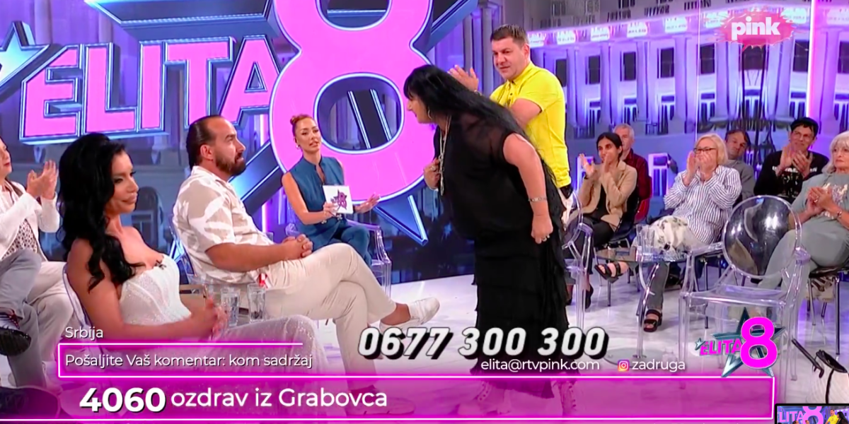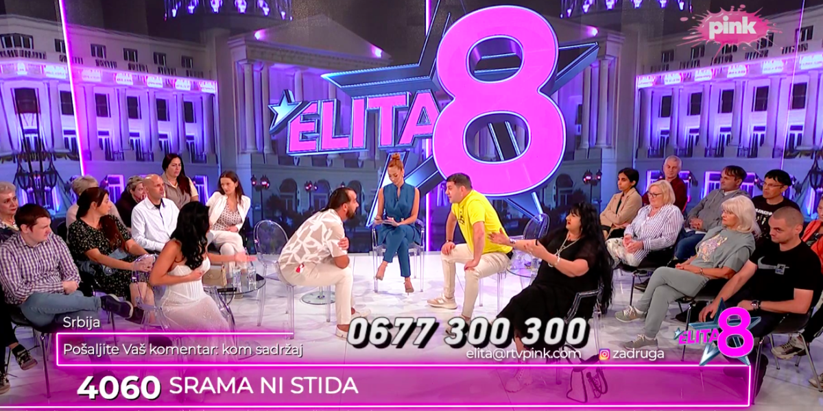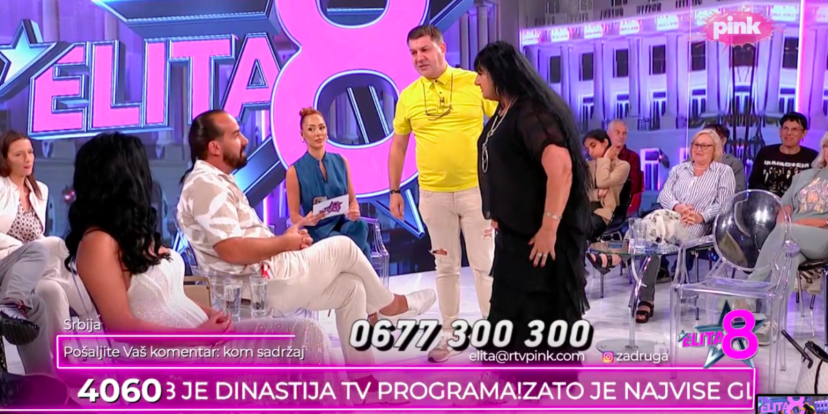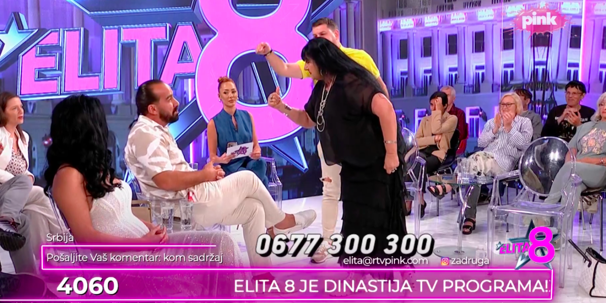 A onda je u emisiji uživo nastao pravi metež. Ivan Marinković i Milosava Pravilović udružili su se i nasrnuli na Aleksandru i Milovana Minića, koji su se u "Eliti 8" pomirili. Paru su uputili salvu uvreda, zbog čega je emisija deset minuta bila bipovana.