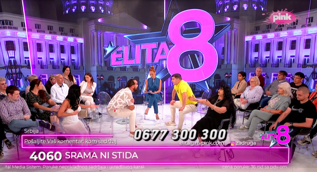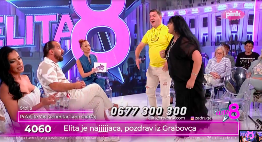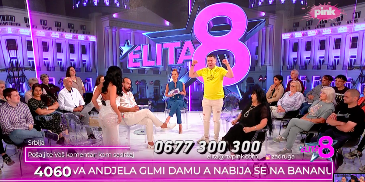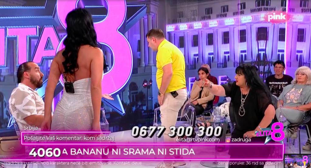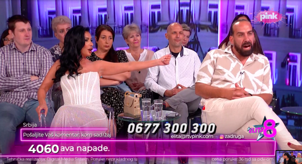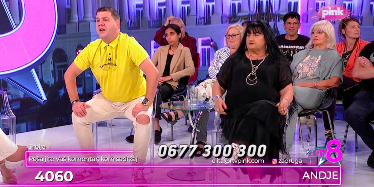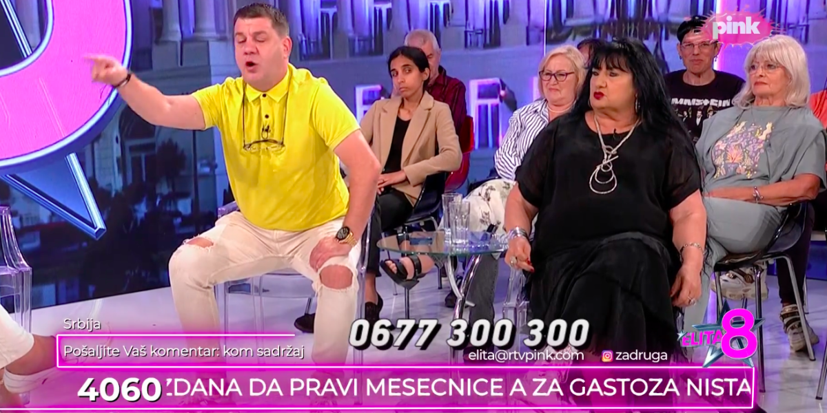 A onda je u emisiji uživo nastao pravi metež. Ivan Marinković i Milosava Pravilović udružili su se i nasrnuli na Aleksandru i Milovana Minića, koji su se u "Eliti 8" pomirili. Paru su uputili salvu uvreda, zbog čega je emisija deset minuta bila bipovana.