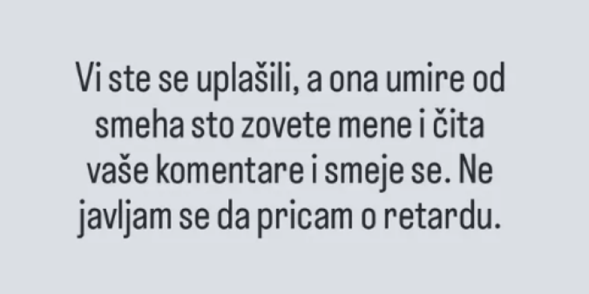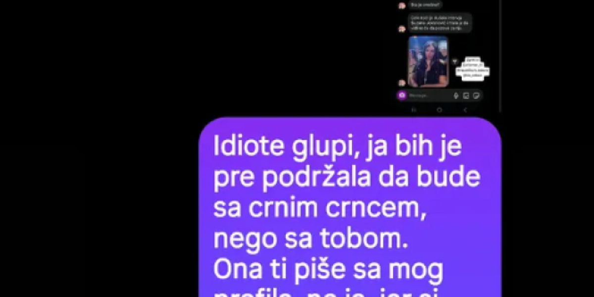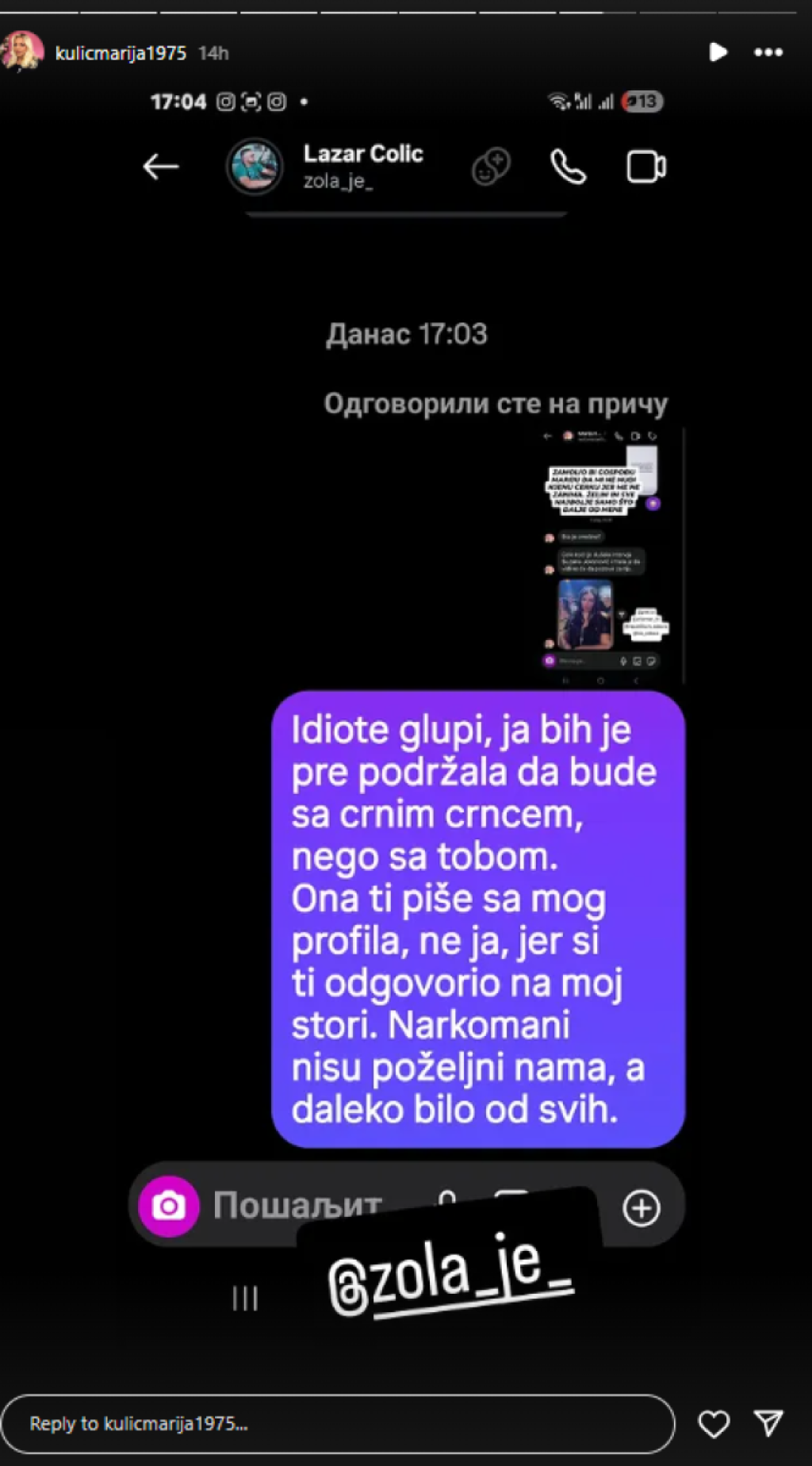 "Idiote glupi, ja bih je pre podržala da bude sa crnim crncem nego sa tobom. Ona ti piše sa mog profila, a ne ja, jer si ti odgovorio na moj stori. Narkomani kod nas nisu poželjni", odbrusila mu je Marija.