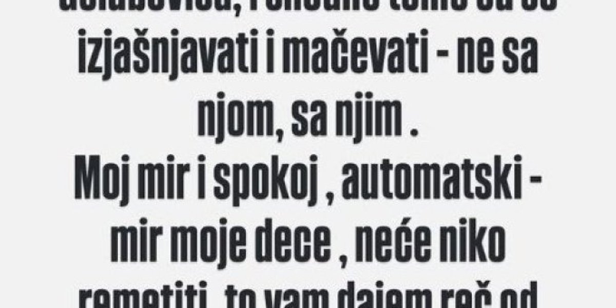"Dakle, sve što dotična bude izgovorila o meni, smatraću lično rečima Kristijana Golubovića i shodno tome ću se izjašnjavati i mačevati - ne sa njom, sa njim. Moj mir i spokoj, automatski - mir moje dece, neće niko remetiti, to vam dajem reč od danas pa zauvek".