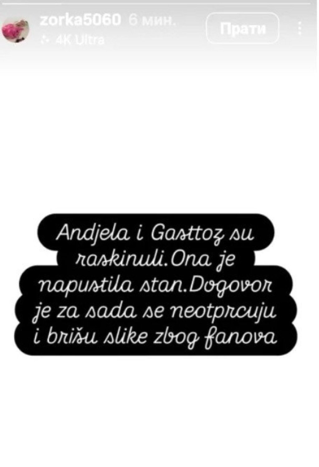 "Anđela i Gastoz su raskinuli. Ona je napustila stan. Dogovor je da za sad ne potenciraju i ne brišu slike zbog fanova", glasila je objava, a ostaje da vidimo da li je to stvarno istina.