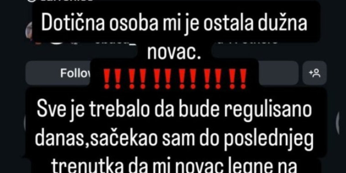 "Sve je trebalo da bude regulisano danas, sačekao sam do poslednjeg trenutka da mi novac legne na račun. S obzirom da novac nije ispoštovan, a dotična večeras ulazi u rijaliti, dužan sam da javno objavim o kome se radi i da se stane na put ovako neodgovornom i bezobraznom ponašanju", napisao je stilista i označio Sarin Instagram profil.