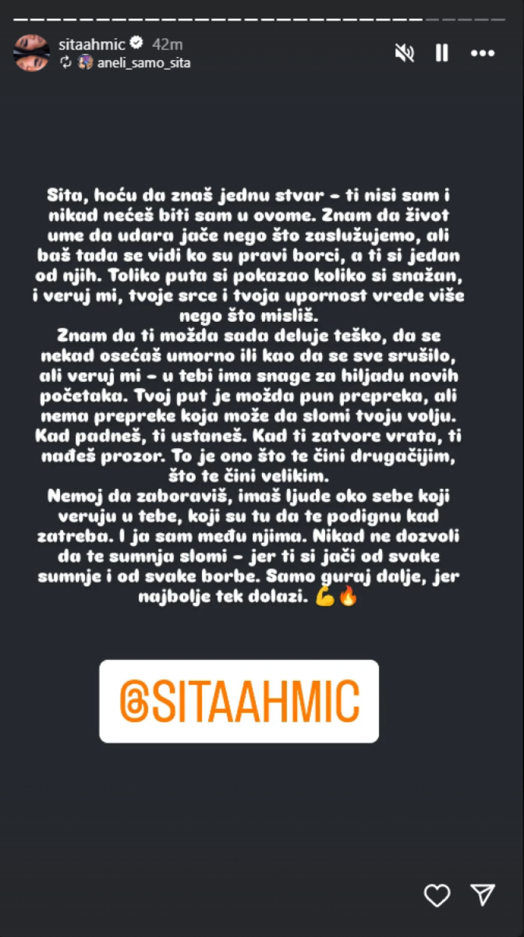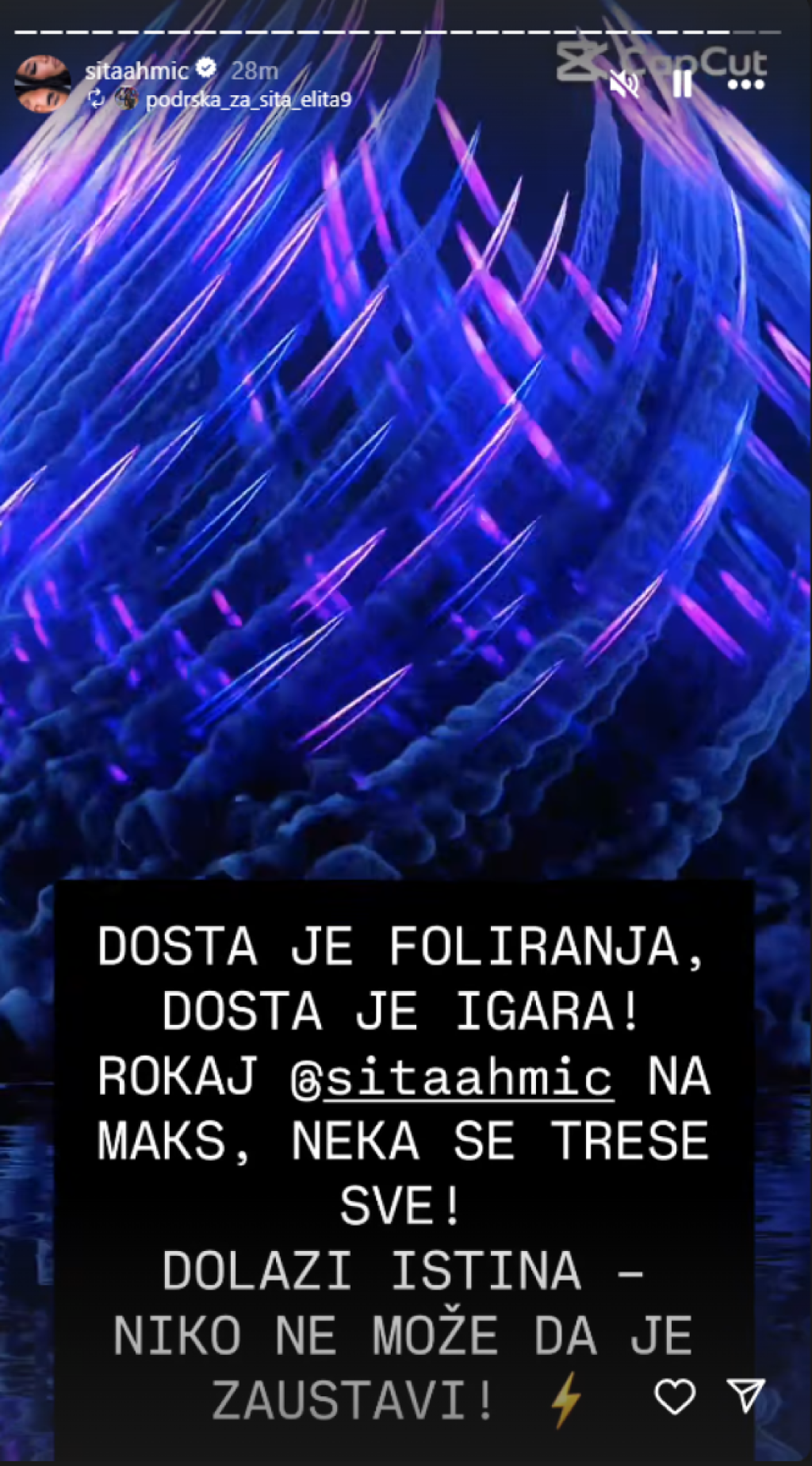 "Dosta je foliranja, dosta je igara! Rokaj, Sita Ahmić, na maksimum, neka se trese sve! Dolazi istina i niko je ne može zaustaviti", pisalo je u objavi, koju je Sita podelila na svom profilu.