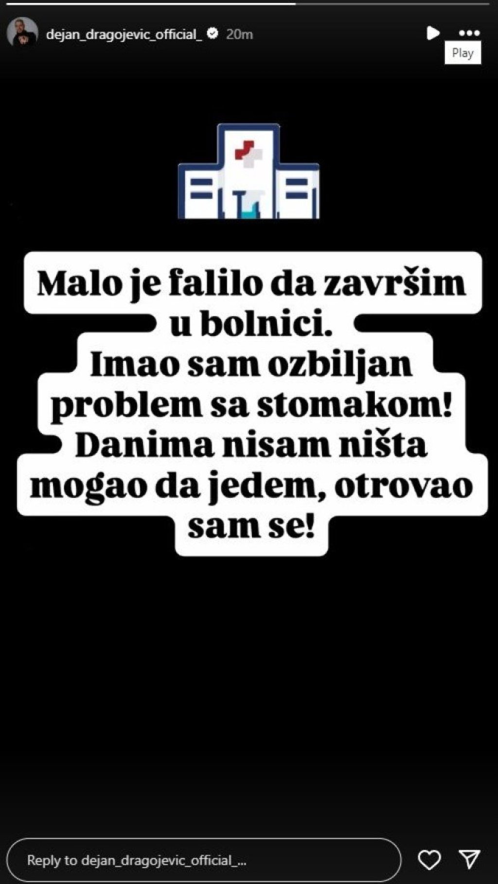 Pobednik rijalitija "Zadruga 5" Dejan Dragojević otkrio je da je nedavno imao ozbiljnih zdravstvenih problema, zbog kojih je, kako sam kaže, bio na ivici da završi u bolnici.