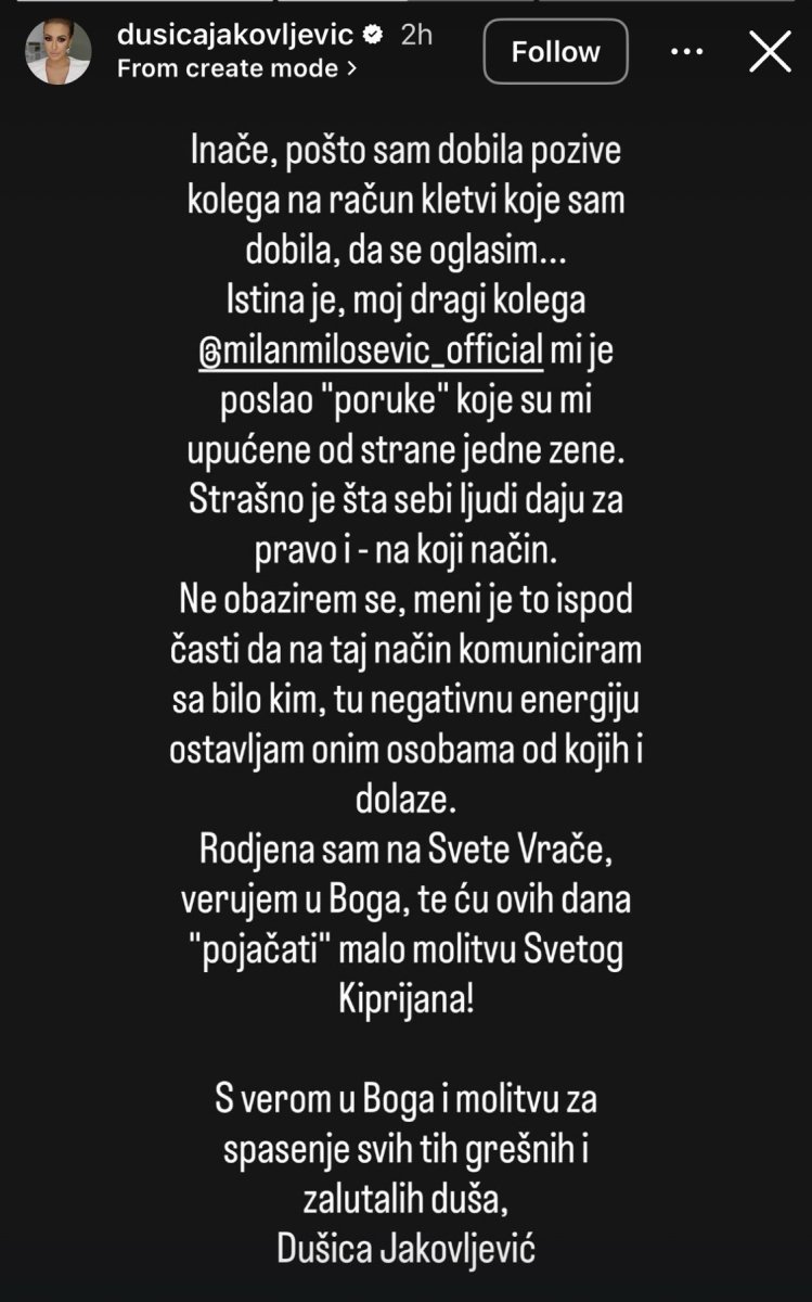 Dušica, koja je sinoć putem Instagrama otkrila kako joj žena baca kletve, je sada ispričala kako je do informacija došla uz pomoć kolege Milana Miloševića, a da je komentar koji je dobila prešao svaku granicu.