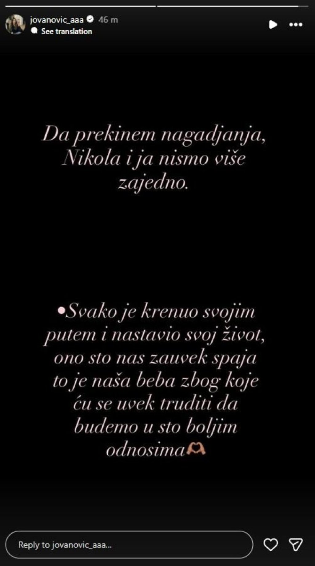 "Da prekinem nagađanja, Nikola i ja nismo više zajedno. Svako je krenuo svojim putem i nastavio svoj život, ono što nas zauvek spaja to je naša beba zbog koje ću se uvek truditi da budemo u što boljim odnosima", napisala je Ana.