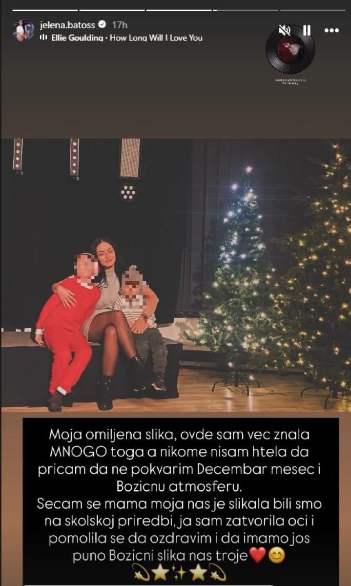 "Moja omiljena slika, ovde sam već znala mnogo toga, a nikome nisam htela da pričam, da ne pokvarim decembar i Božićnu atmosferu. Sećam se, mama moja nas je slikala, bili smo na školskoj priredbi, ja sam zatvorila oči i pomolila se da ozdravim i da imamo još puno Božićnih slika nas troje", napisala je bivša rijaliti učesnica.