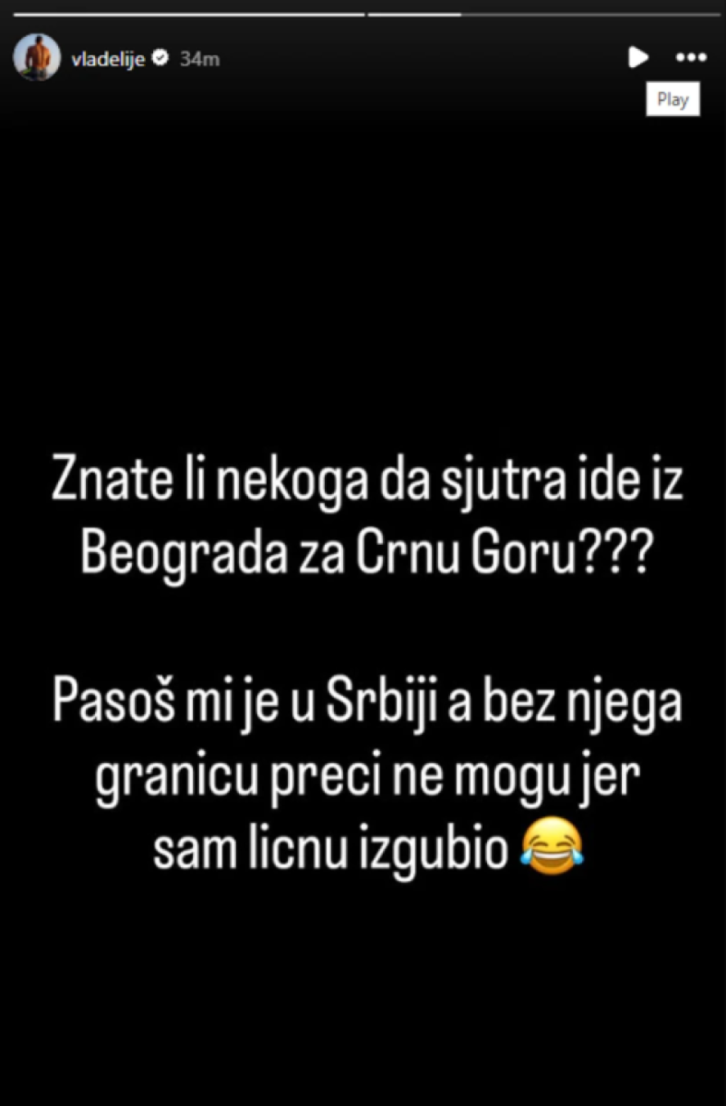 "Koliko budala znate koji krenu na voz i shvate da ne znaju gde im je pasoš? Ja jednu i evo je na slici. Vi?", napisao je Vladimir, dok je u pozadini išla pesma Riblje Čorbe "Kako je lepo biti glup".