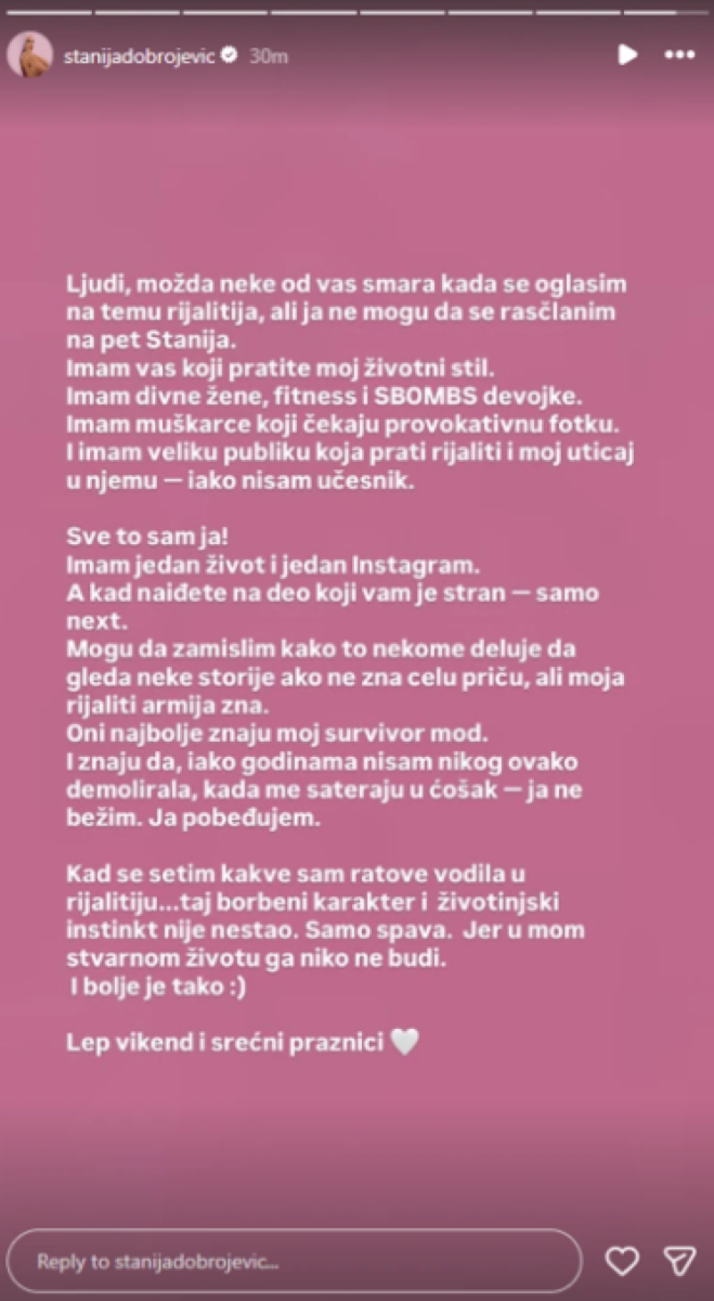 "Ljudi, možda neke od vas smara kada se oglasim na temu rijalitija, ali ja ne mogu da se raščlanim na pet Stanija. Imam vas koji pratite moj životni stil. Imam divne žene, fitnes devojke. Imam muškarce koji čekaju provokativnu fotku. I imam veliku publiku koja prati rijaliti i moj uticaj u njemu, iako nisam učesnik", napisala je Stanija i dodala: