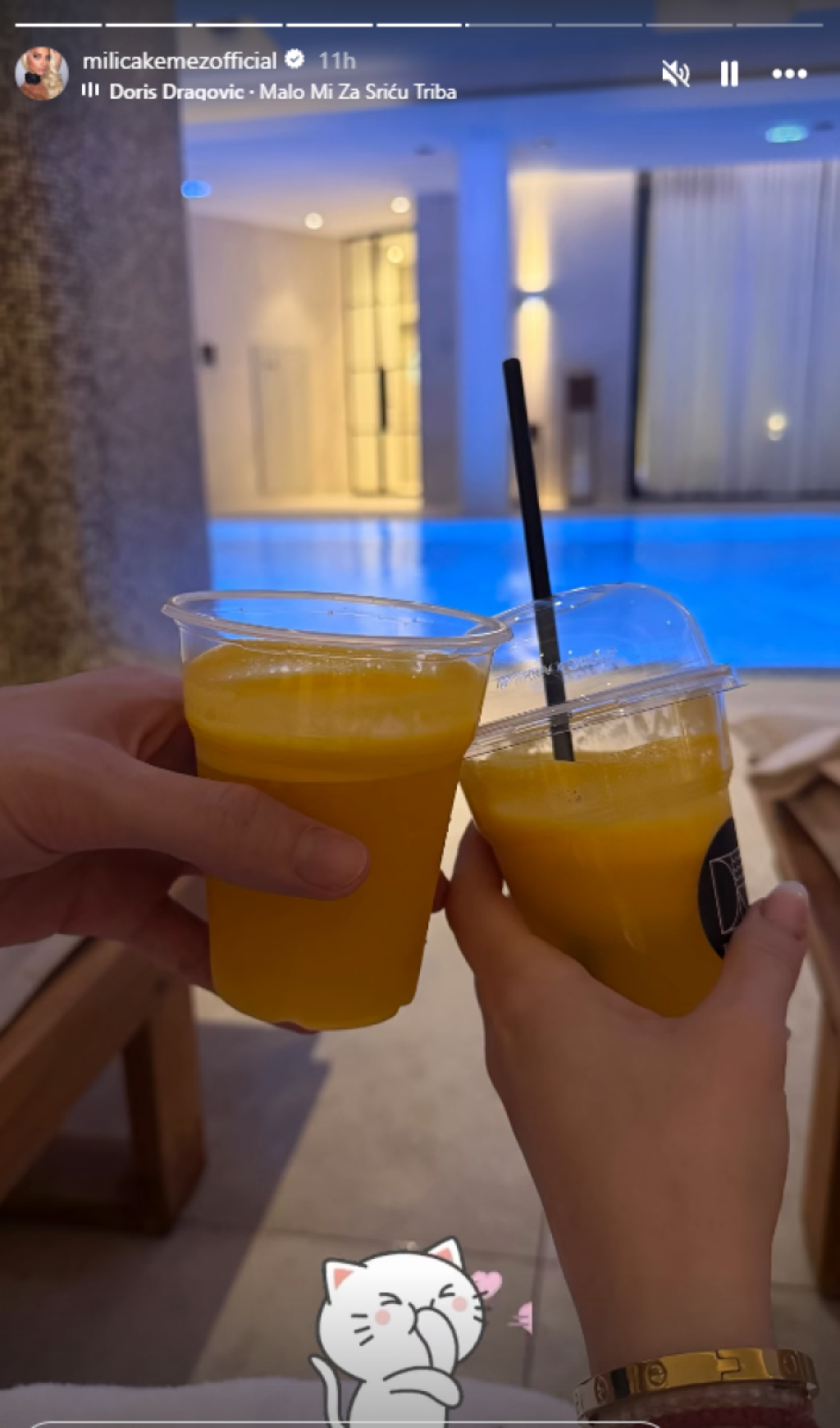 Ipak, fanovima je dala mali uvid u njihovo zajedničko vreme - objavila je fotografiju na kojoj zajedno nazdravljaju čašama, dok se u pozadini jasno vidi bazen i potpuno opuštena atmosfera.