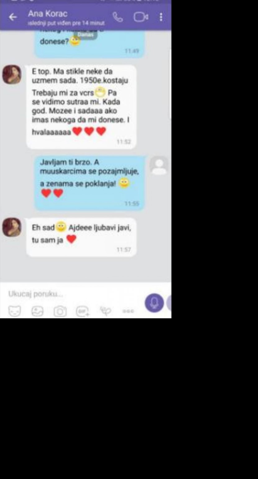 - E top. Ma štikle neke da uzmem sada. 1950e koštaju. Trebaju mi za večeras, pa se vidimo sutra mi. Kada god. Može i sada, ako imaš nekog da mi donese i hvala - odgovorila je Koraćeva.